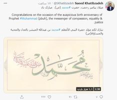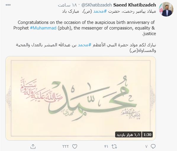 سعید خطیب زاده سخنگوی وزارت امور خارجه، میلاد با سعادت حضرت محمد (ص) را به سه زبان تبریک گفت: میلاد پیامبر رحمت، حضرت محمد (ص)، مبارک باد