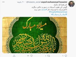 به گزارش شبکه مردم خبر گروه مجازی خبرگزاری صدا و سیما، همزمان با ۱۷ ربیع الاول میلاد باسعادت حضرت ختمی مرتبت محمد مصطفی (ص) و امام جعفر صادق (ع) امام ششم شیعیان، کاربران فضای مجازی در توئیتر نیز دست به کار شدند و ضمن تبریک این روز، در وصف پیامبر اعظم (ص) نوشتند.