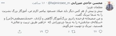 و من صمیمانه فرخنده زادروز بزرگآموزگار آگاهی و آزادی، «محمّدمصطفی»(ص) و «سلالهی صادقش» را به شما خِردورزانی که «راهبر طریق تربیت و تعالی» هستید، تبریک و تهنیت میگویم.