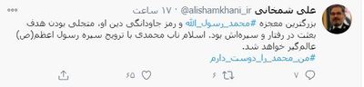 علی شمخانی دبیر شورای عالی امنیت ملی نوشت: بزرگترین معجزه محمد رسول الله و رمز جاودانگی دین او، متجلی بودن هدف بعثت در رفتار و سیرهاش بود. اسلام ناب محمدی با ترویج سیره رسول اعظم(ص) عالمگیر خواهد شد.