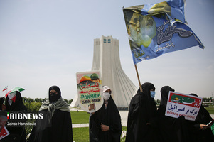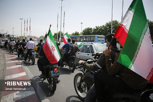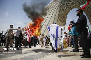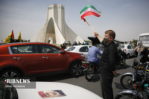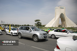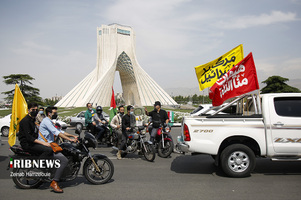راهپیمایی خودجوش خودرویی و موتوری مردمی روز قدس همراه با آتش کشیدن پرچم آمریکا و اسرائیل امروز جمعه ۱۷ اردیبهشت در میدان آزادی برگزار شد.