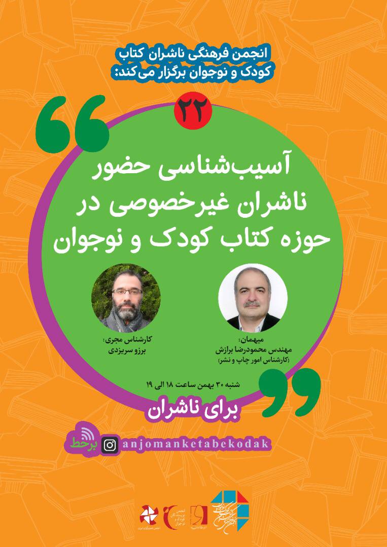 انجمن فرهنگی ناشران کتاب کودک و نوجوان ، بیست و دومین همایش را با موضوع "آسیبشناسی حضور ناشران غیرخصوصی در حوزه کتاب کودک و نوجوان"، مجازی برگزار می کند.