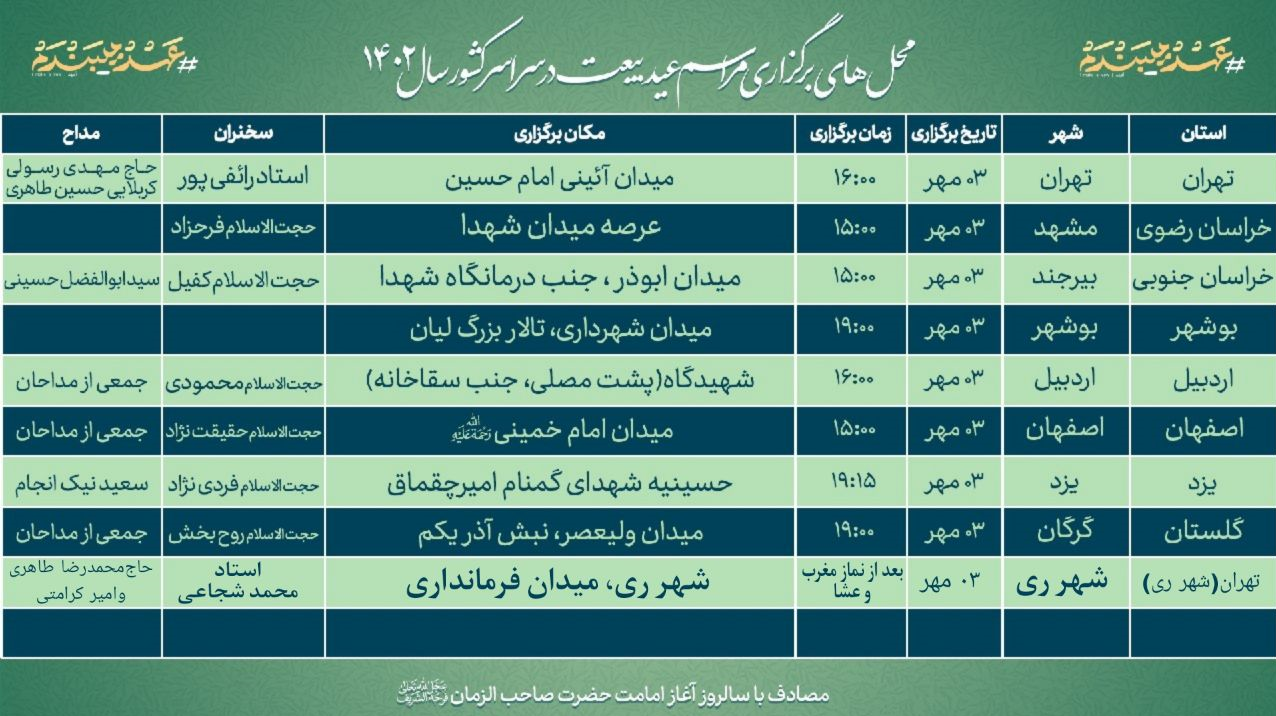 در تهران این مراسم در میدان آئینی امام حسین (ع) روز دوشنبه سوم مهر از ساعت ۱۶ برگزار خواهد شد. علاوه بر این، مراسم دیگری در مهدیه تهران با عنوان عید بزرگ بیعت از ساعت ۲۰ برگزار میشود.