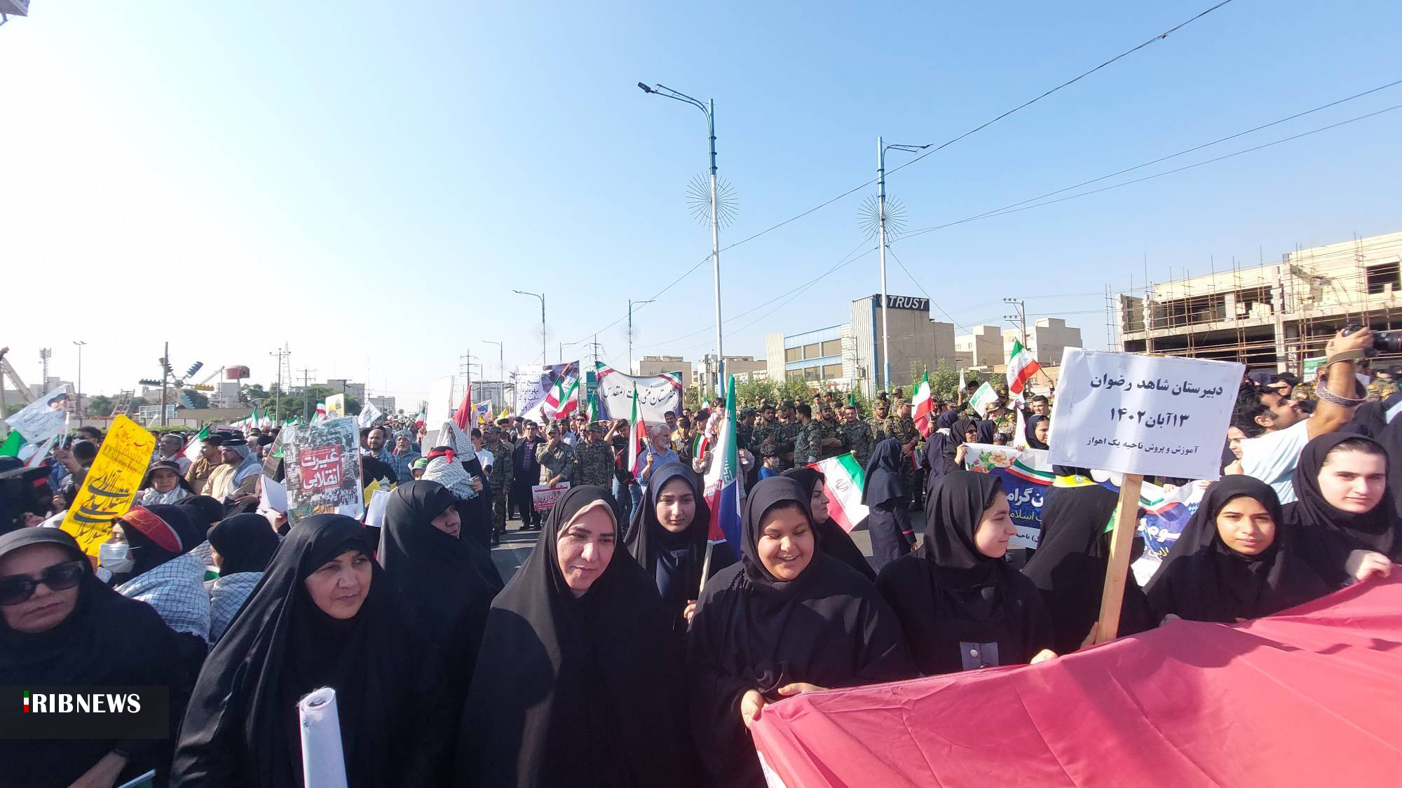 جمعی از دانشآموزان در این راهپیمایی پلاکاردهایی با مضامین مرگ بر اسراییل، مرگ بر آمریکا، ۱۳ آبان، یوم الله و جانم فدای رهبر در دست داشتند.