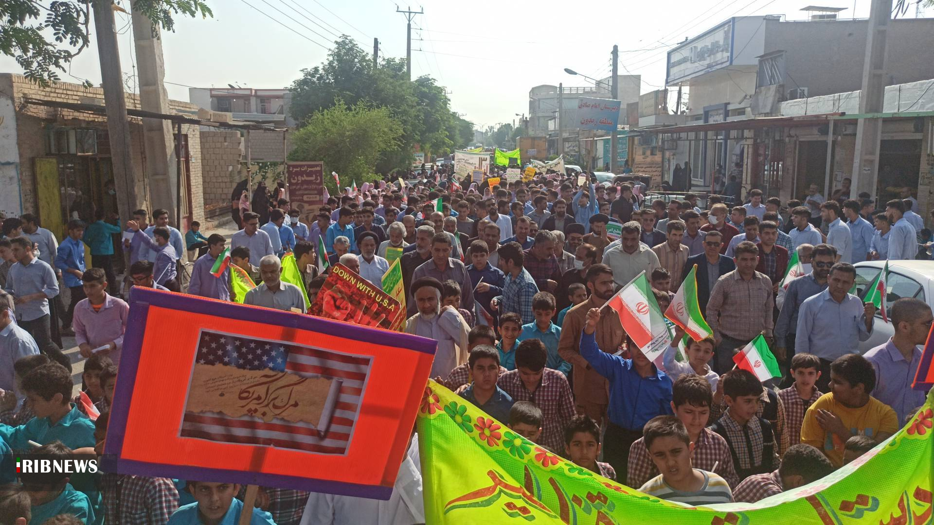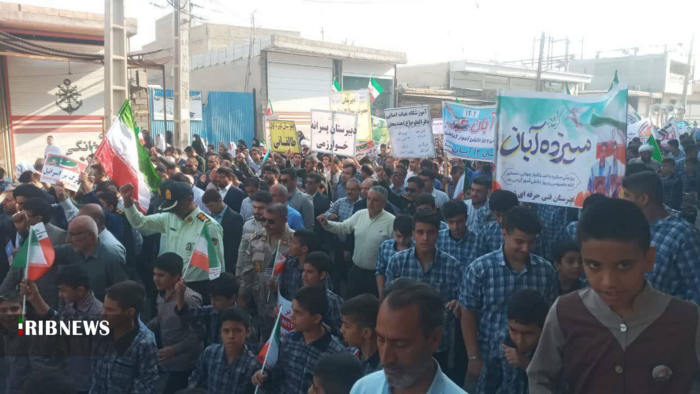 امروز و از ساعتهای اولیه صبح، مردم شهرهای مختلف استان خوزستان بار دیگر همبستگی و اتحاد خود را در دفاع از آرمانهای انقلاب و حفظ ایران اسلامی نشان دادند و با سر دادن شعار مرگ بر اسراییل و مرگ بر آمریکا انزجار خود را از «شیطان بزرگ» فریاد زدند.